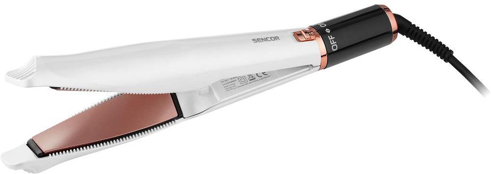 Žehlička na vlasy – keramický povrch doštičiek, šírka doštičiek 27 mm, 5 teplotných stupňov, rozsah teploty od 145 do 230 °C, doba nahriatia 50 s, digitálna regulácia teploty, automatické vypnutie, regulácia teploty, vhodná aj na tvorbu vĺn, LED displej, príkon 50 W, biela, čierna a zlatá farba, bezpečnostný zámok a flexibilný kábel, sieťové napájanie, úložné puzdro súčasťou balenia, rozmery 37 × 37 × 330 mm (V׊×D), hmotnosť 338 g Žehlička na vlasySHI 4600GDProfesionálne účesy domaTúžite po rovných vlasoch, alebo jemných vlnách? So žehličkou a kulmou 2 v 1 Sencor SHI 4600RS to zvládnete ľahko doma. Špeciálne krútené dosky umožň