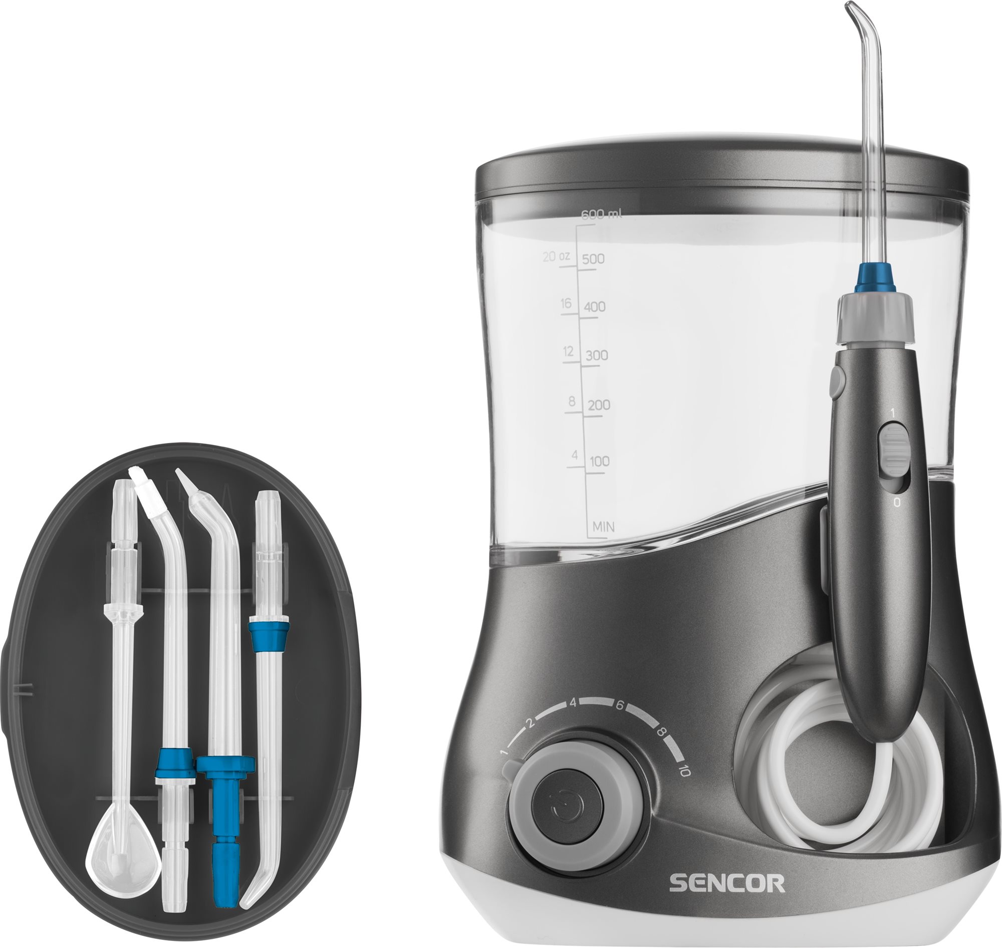 Elektrická ústna sprcha – vyhotovenie: ústne centrum, pre mostíky, korunky a strojček na zuby, dýzy štandardné, ortodontické a na jazyk, 4 dýzy v balení, objem nádržky 600 ml, časovač, režimy čistenia a displej, režim jednotný…