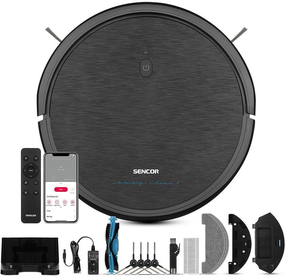 Robotický vysávač s mopom – pre alergikov, na zvieracie chlpy a antibakteriálny, na všetky druhy podláh, na suché čistenie, HEPA, automatické dobíjanie, senzor proti nárazu, vysávanie viacerých miestností, senzor proti pádu zo schodov a funkcia odloženého upratovania, kefy odolné proti namotávaniu vlasov, mäkčené kolieska, ovládanie mobilnou aplikáciou zberná nádoba, 2 bočné kefy, prekoná prekážky do výšky 1,5 cm, základná navigácia, doba prevádzky 100 min, doba nabíjania 5 h, hlučnosť 60 dB, príkon 28 W, rozmery 7,5 × 30,5 × 30,5 cm (V׊×H), akumulátor a nabíjacia stanica súčasťou balenia Robotický vysávačSRV 3160TQ EasyClean+Na čistenie podláh v celom domeRobotický vysávač SENCOR SRV 3160TQ EasyClean+ sa postará o ľahké čistenie podláh v celom dome. Na ovládanie sa používa jedno tlači