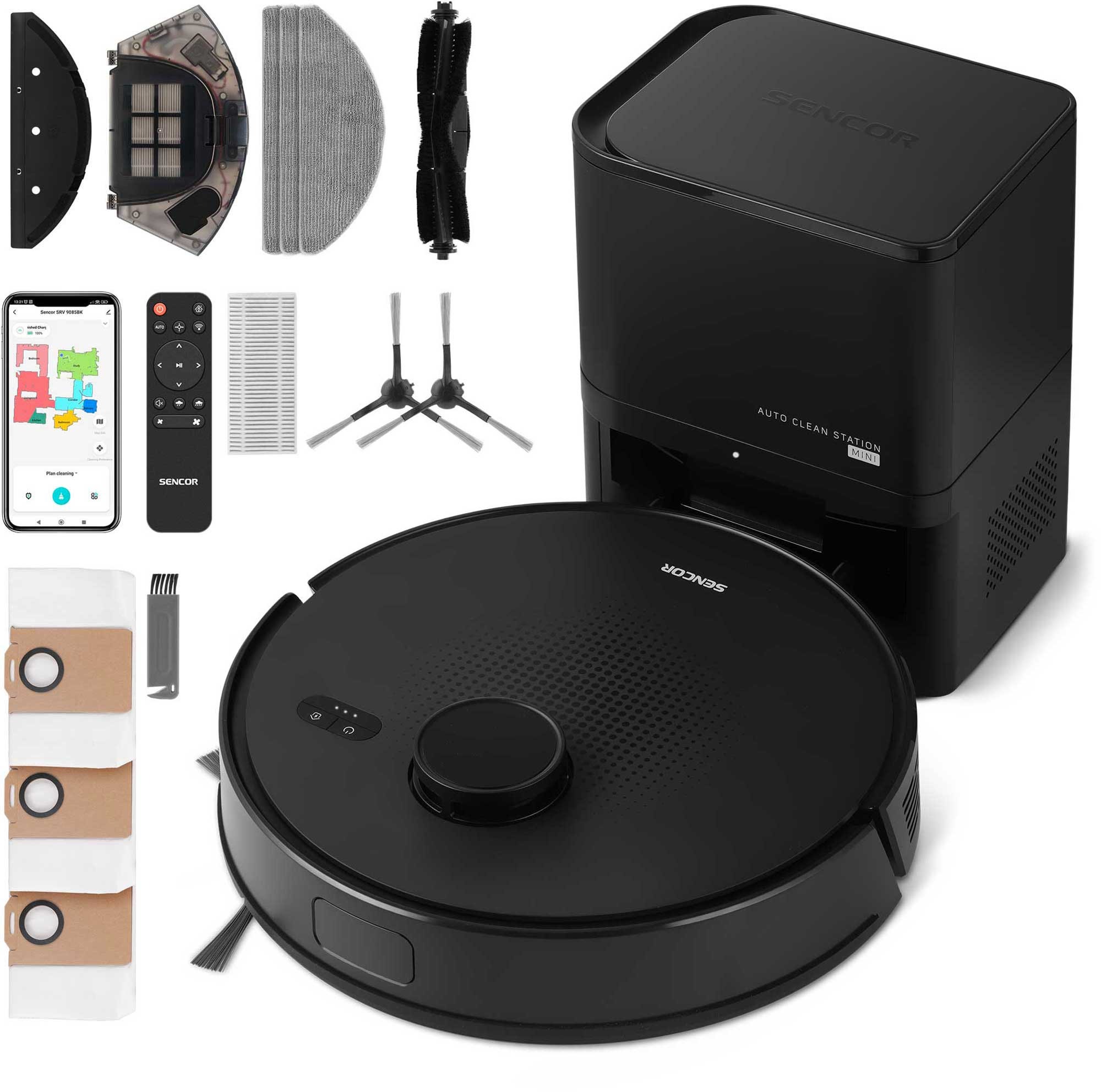 Robotický vysávač s mopom – pre alergikov, na zvieracie chlpy a antibakteriálny, na všetky druhy podláh, na suché čistenie, HEPA, senzor proti nárazu, pokračovanie upratovania po samostatnom dobití, vysávanie viacerých miestností, senzor proti pádu zo schodov, predvoľba miestností na upratovanie, funkcia proti zamotaniu káblov, hovoriaci po česky a hovoriaci po slovensky, kefy odolné proti namotávaniu vlasov, mäkčené kolieska, ovládanie mobilnou aplikáciou, plastová zberná nádoba, 1 bočná kefa, prekoná prekážky do výšky 1,6 cm, laserová, gyroskopická a LiDAR navigácia, doba prevádzky 130 min, doba nabíjania 5 h, hlučnosť 60 dB, príkon 40 W, rozmery 9,7 × 32 × 32 cm (V׊×H), akumulátor a nabíjacia stanica súčasťou balenia Robotický vysávačSRV 9085BKRobotický vysávač Sencor SRV 9085BK pre ľahké upratovanie s perfektným výsledkomUpratovanie pevných podláh a kobercov je s inteligentným robotickým vysávačom Sencor SRV 9085