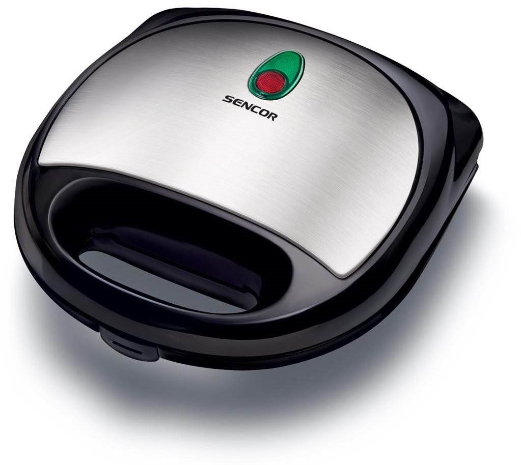 Toustovač – na 4 toasty, trojuholníkové platničky, s nepriľnavým povrchom, súčasťou balenia platničky vhodné na sendviče, s automatickou reguláciou teploty, uzamykateľný, tepelne izolovaná rukoväť a protišmykové nôžky súčasťou, príkon 700 W, antikorový plášť, dĺžka kábla 75 cm, čierna a strieborná farba, rozmery 10,5 × 23,8 × 23,4 cm (V׊×H) ToustovačSSM 4300SSPomocník pre rýchle raňajkyJedinečný sendvičovač Sencor vám poskytne komfortne pripravené chutné raňajky alebo desiatu. Dizajnovo vyladený sendvičovač je zhotovený z antikoru a zdob