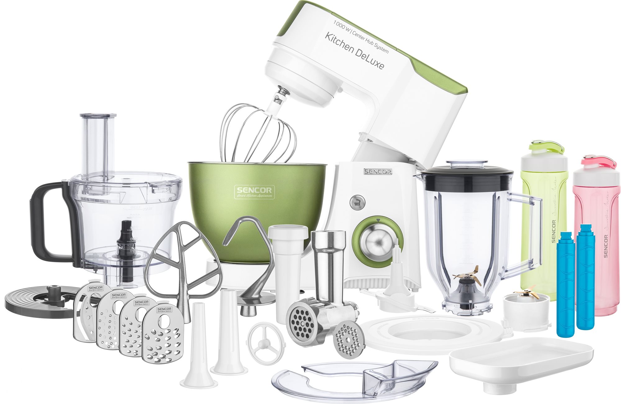 Kuchynský robot – planetárne hnetenie, príkon 1000 W, kovové vnútorné prevody, plastový plášť, materiál misy nerez, objem misy 4,5 l, 8 rýchlostí, plynulá regulácia otáčok, tlačidlo PULSE, funkcie šľahanie, miesenie a hnetenie, súčasťou nadstavec na plnenie údenárskych produktov, mlynček na mäso, nadstavec na mixovanie, šľahacia metlička (balónová metlička), hnetací hák, miešacia metlička (stierková metlička), misa, mixovacia nádoba, veko, hlučnosť 85 dB, hmotnosť 8,2 kg, rozmery 33,5 × 22 × 36,5 cm (V׊×H), zelená farba Kuchynský robotSTM 4460GGKuchynský robot s výkonným motoromObjavte Sencor kuchynský robot STM 4460GG. S výkonným motorom so silou 1 000 W a so štyrmi výstupovými konštrukciami zastane aj tú najnáročne