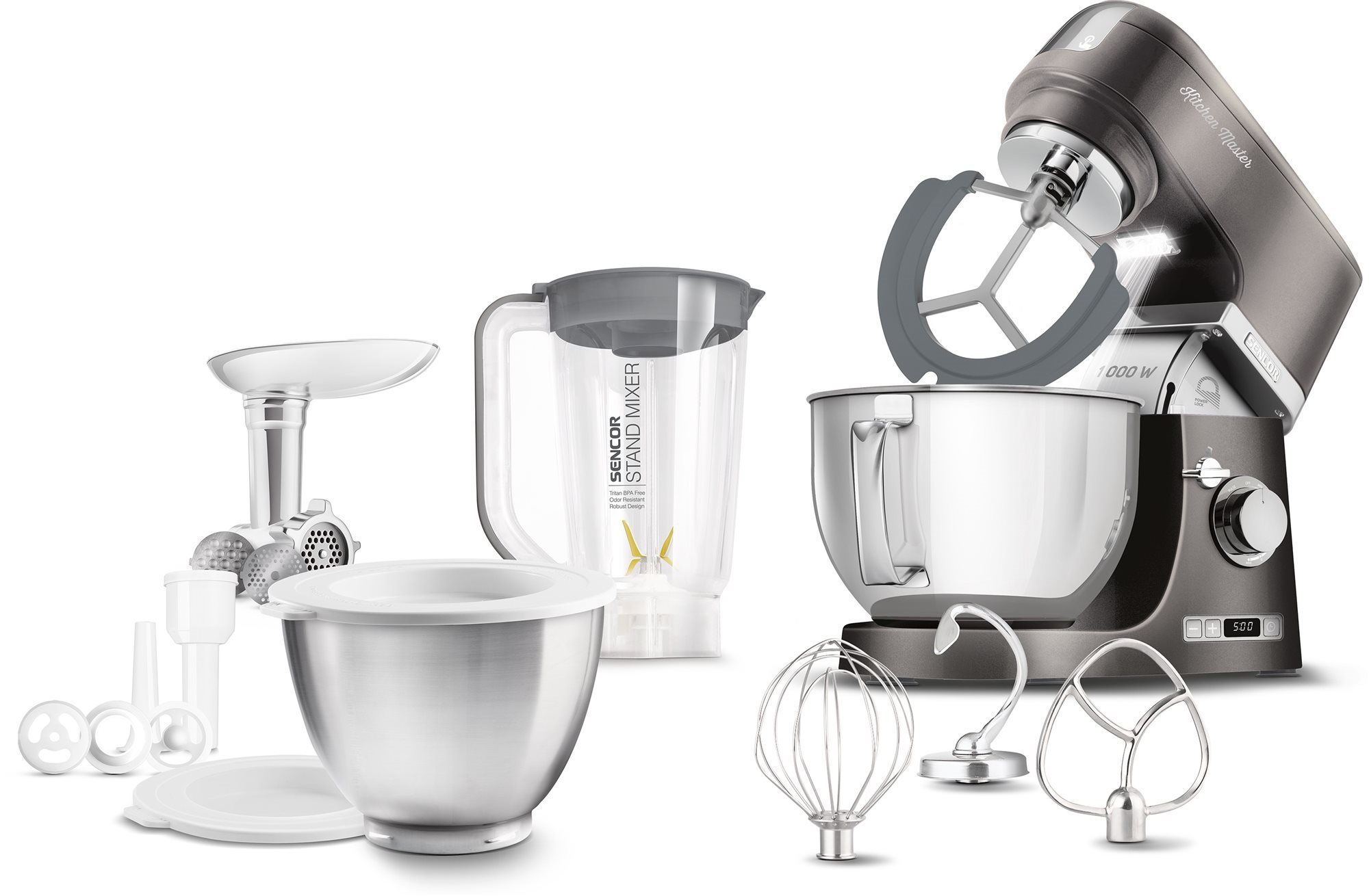 Kuchynský robot – celokovový, planetárne hnetenie, príkon 1000 W, kovové vnútorné prevody, antikorový plášť, materiál misy nerez, objem misy 4,5 l, 8 rýchlostí, tlačidlo PULSE, s automatickými receptami, funkcie šľahanie, miesenie a hnetenie, súčasťou nadstavec na plnenie údenárskych produktov, mlynček na mäso, nadstavec na mixovanie, šľahacia metlička (balónová metlička), plochá metlička (flexi metlička), hnetací hák, k-metlička, miešacia metlička (stierková metlička), misa, mixovacia nádoba, veko a utláčadlo, hlučnosť 85 dB, hmotnosť 9,6 kg, rozmery 32,3 × 24,5 × 35 cm (V׊×H), čierna farba Kuchynský robotSTM 7878BKKuchynský robot od Sencoru s výkonom 1 000 WS naozaj silným motorom dokáže urobiť kuchynský robot SENCOR STM 7878BK veľký kus práce a uľahčiť celý proces prípravy v krátkom ča