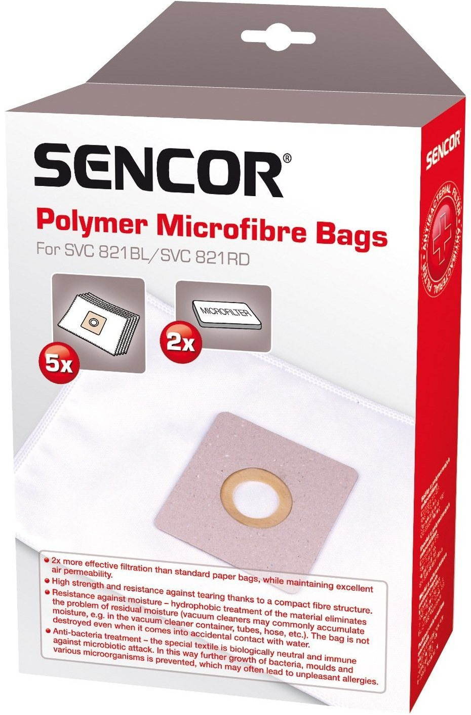 Vrecká do vysávača SEVERIN – textilné, jednorazové, antibakteriálne, odolné proti vlhkosti, objem 2,5 l, súčasťou balenia je tiež filter, 5 vreciek v balení Toto originálne vrecko určené do vysávača SENCOR SVC821RD/BL je určené na jednorazové použitie a ponúka objem 2,5 litra. Vďaka mikrovlákennej konštrukcii ponúka