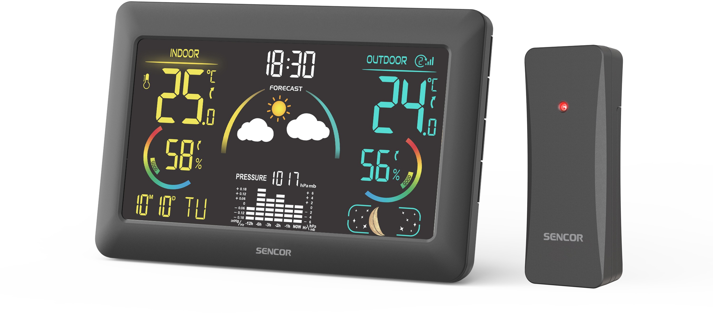 Meteostanica – domáca, bezdrôtová, vnútorná, s predpoveďou počasia, opakované budenie, budík a príjem DCF, meranie barometrického tlaku, teploty, vlhkosti, zobrazuje čas, dátum a fázy mesiaca, dosah bezdrôtového snímača 80 m, maximálne možno pripojiť 3 bezdrôtové snímače,, hlavná jednotka, snímač a napájací adaptér súčasťou balenia, umiestnenie na stôl, rozmery 129 × 200 × 30 mm (V׊×H) MeteostanicaSWS 4900Kľúčové vlastnosti meteostanice SENCOR SWS 4900Meria teplotu a vlhkosťPredpoveď počasia ikonamiFarebný LCD displejČas riadený signálom DCF77Varovanie pred mrazomNapájanie adaptérom