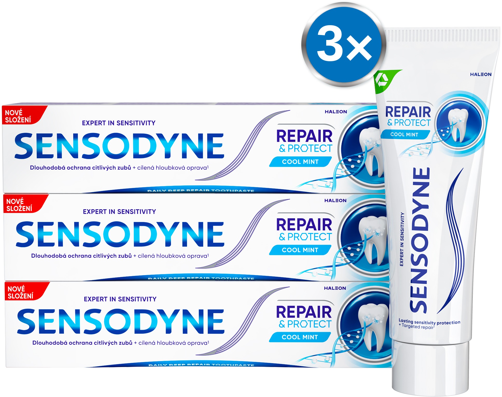 Zubná pasta – na citlivé zuby, objem 225 ml, 3 zubné pasty v balení Zubná pasta SENSODYNE Repair & Protect pre citlivé zubyNovej zubnej paste SENSODYNE Repair & Protect môžete dôverovať, že sa o vaše zuby postará bez akýchkoľvek obáv. Obsahuje látku, ktorá dok