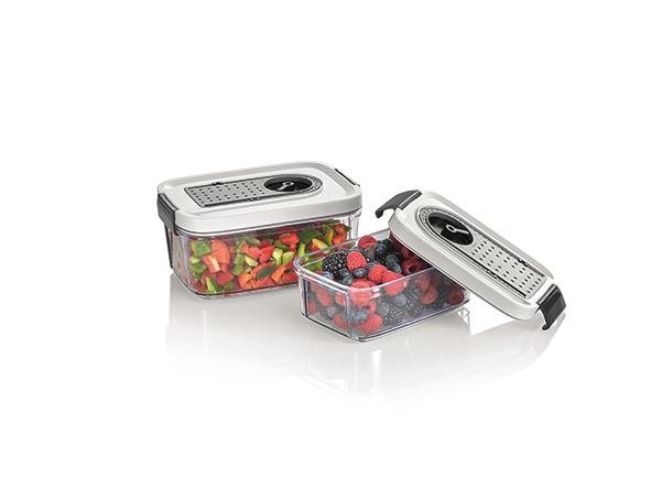 Dózy na potraviny – materiál dózy plast, obdĺžniková, tesniaca a vákuovacia, veko s klipmi, materiál veka plast, vhodná do umývačky, mrazničky a chladničky, 2 dózy Hlavné prednosti sady dóz na potraviny SEVERIN ZU 3618 Vákuové dózy SEVERIN umožnia efektívne skladovanie potravín Udržujú jedlo dlhšie čerstvé Napomôžu s praktickým usporiadaním domácnosti Vďaka nim