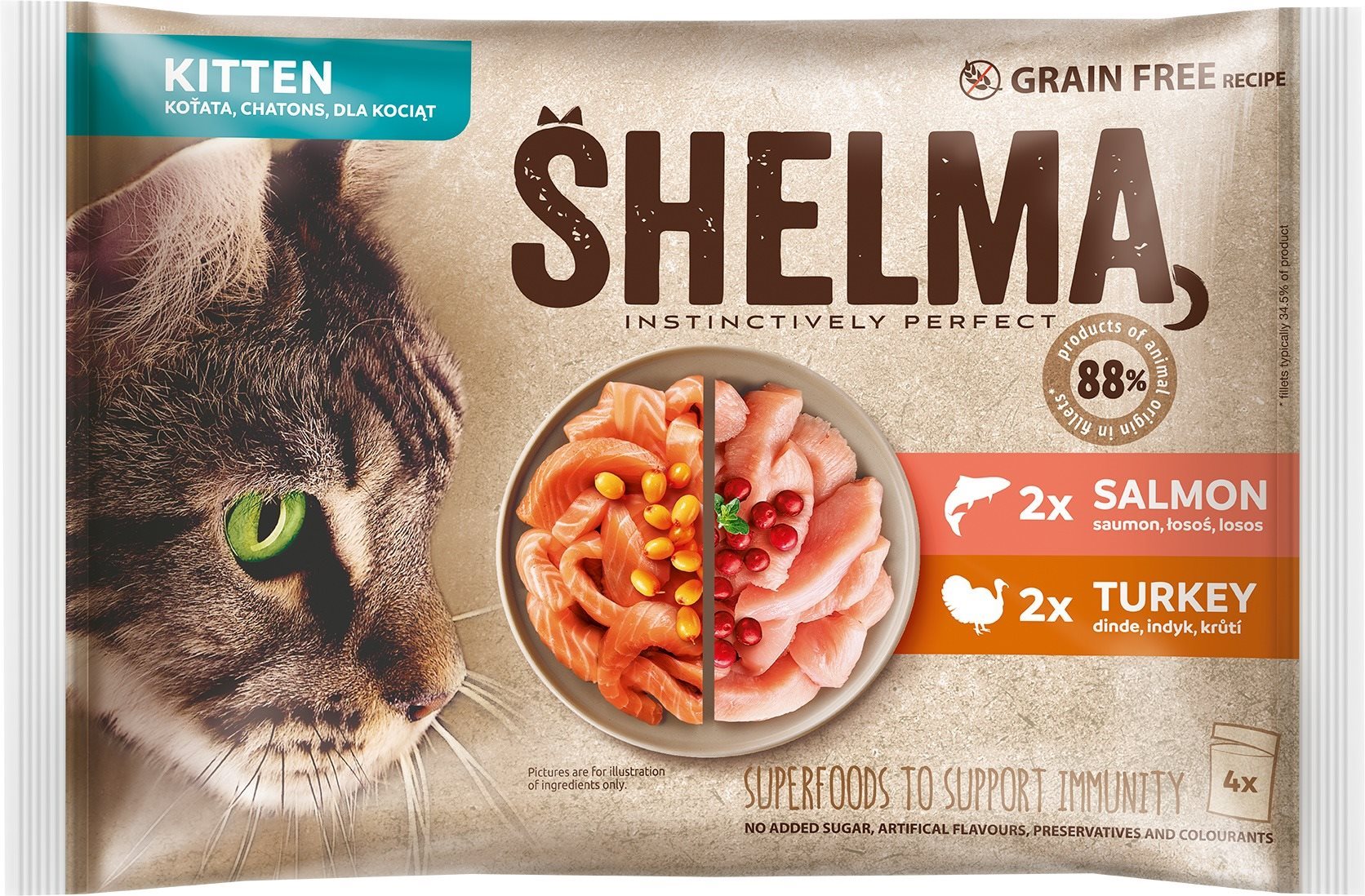 Shelma Kitten dusené filetky bez obilnín, losos a morka 4× 85 g