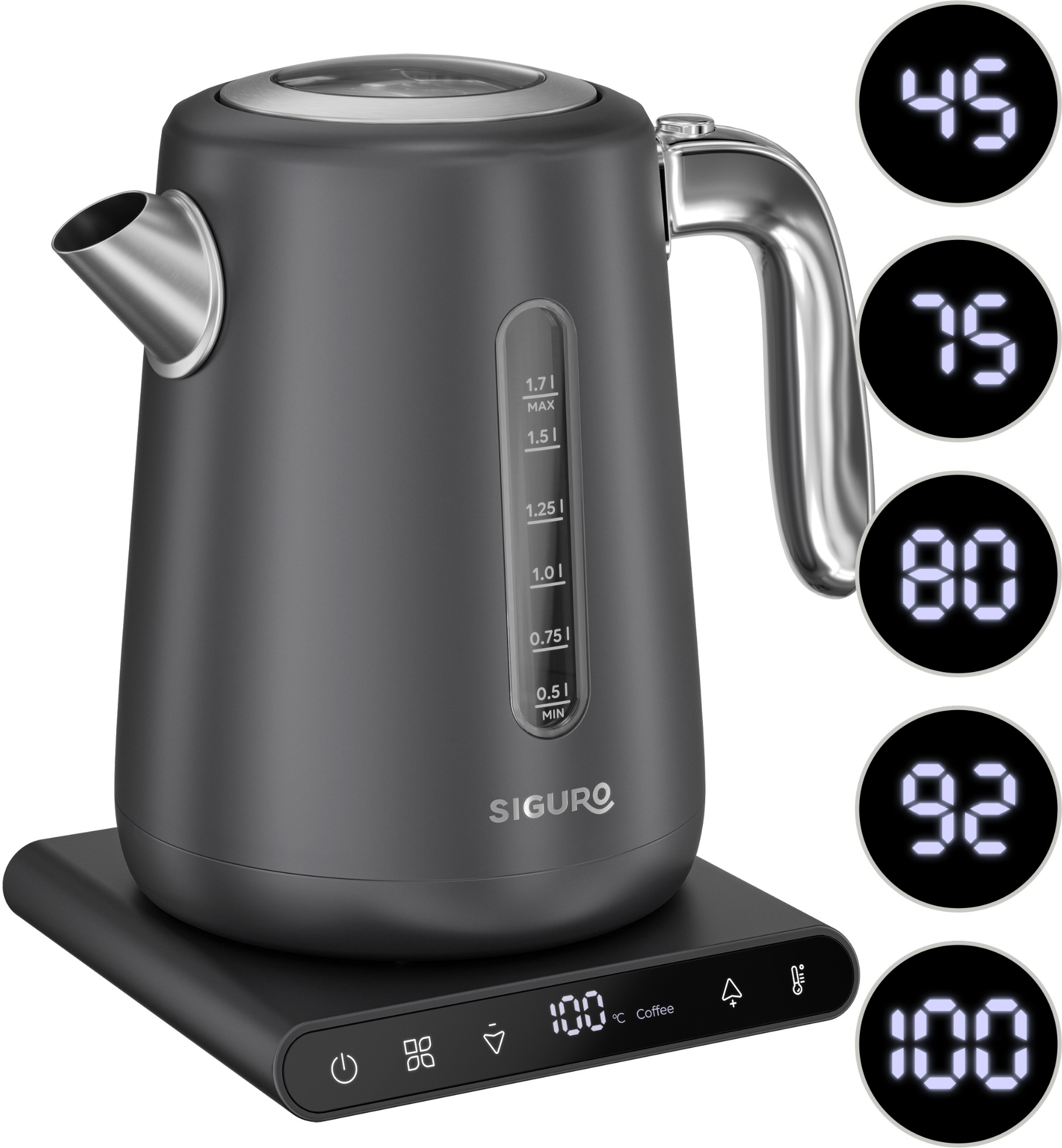 Rýchlovarná kanvica – s reguláciou teploty 45 – 100 °C v krokoch po 1 °C, 5 prednastavených teplôt, objem 1,7 l, príkon 2 150 W, britský Strix konektor so životnosťou viac ako 12 000 použití, 360° otočná základňa, materiál nehrdzavejúca oceľ, dotykové ovládanie s displejom, funkcia udržiavania teploty (až 2 hodiny), zaistenie veka, automatické vypnutie pri nedostatku vody a dosiahnutí nastavenej teploty, skrytá tepelná špirála, antidrip veko, dĺžka kábla 70 cm, 3 roky záruka Rýchlovarná kanvica Siguro Darwin D770YElegantná rýchlovarná kanvica Siguro Darwin D770Y s objemom 1,7 l spája moderný dizajn, praktické funkcie a kvalitné spracovanie. Disponuje základňou s dotykovým