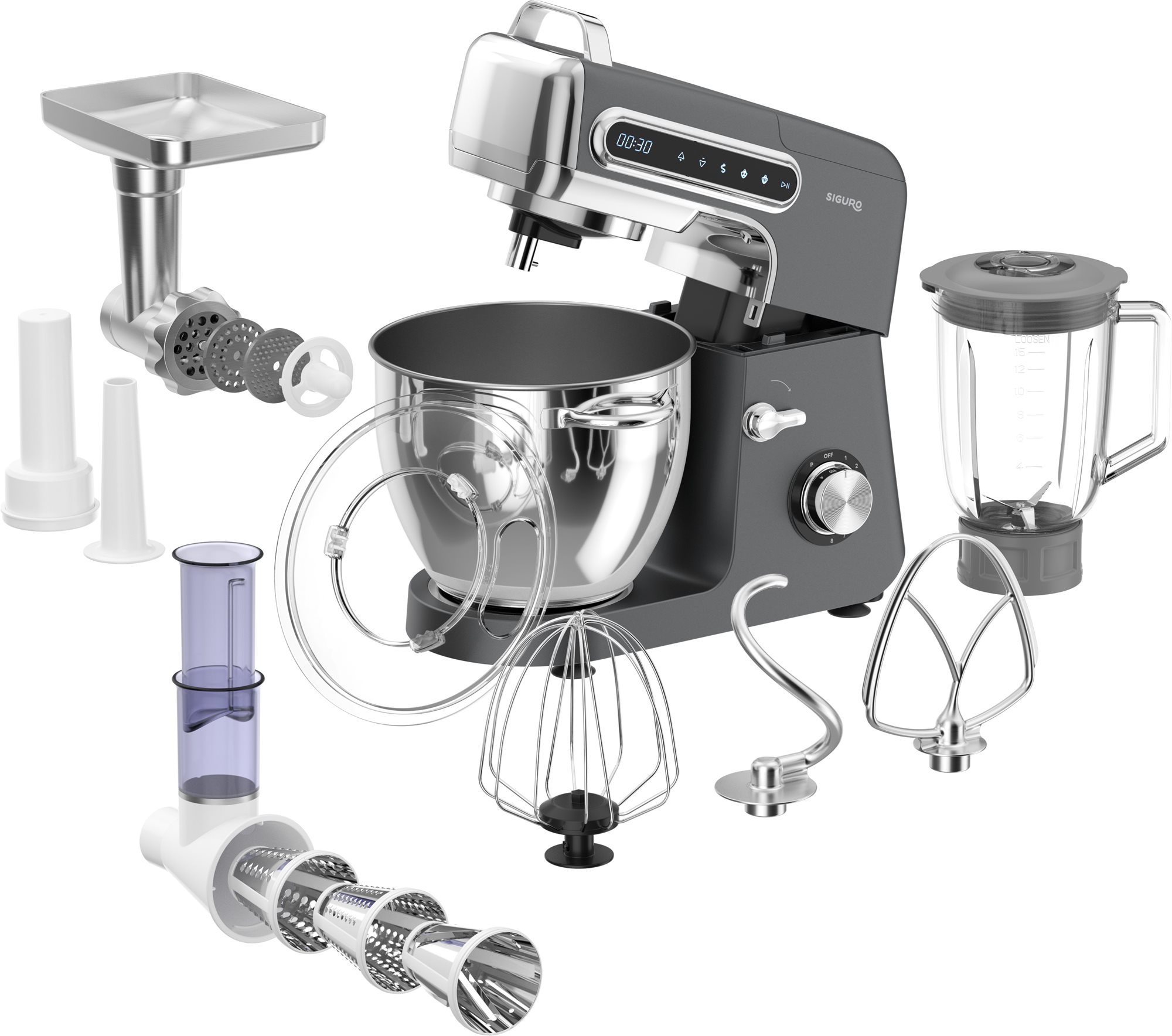 Kuchynský robot – celokovový, planetárne miesenie, príkon 1800 W, celokovové prevody, misa s uchami z nehrdzavejúcej ocele, objem 6 l, 8 rýchlostí, digitálny displej, časovač, tlačidlo PULSE, bezpečnostná poistka, funkcie: šľahanie, miešanie, hnetenie, mixovanie, mletie mäsa, strúhanie a plátkovanie, súčasťou veko, miešacia metla, hnetací hák, šľahacia metla, mixér, mlynček na mäso a strúhadlo, max. hlučnosť 75 dB, dĺžka kábla 1 m, hmotnosť 8,2 kg, rozmery 37 × 40 × 23,5 cm (V׊×H), sivá farba Siguro KM-M351 Kitchen Machine MaxiChcete si ušetriť veľa práce a námahy? Zaobstarajte si kuchynský robot Siguro KM-M351 Kitchen Machine Maxi s bohatým príslušenstvom a dajte zdĺhavým ručným prácam v