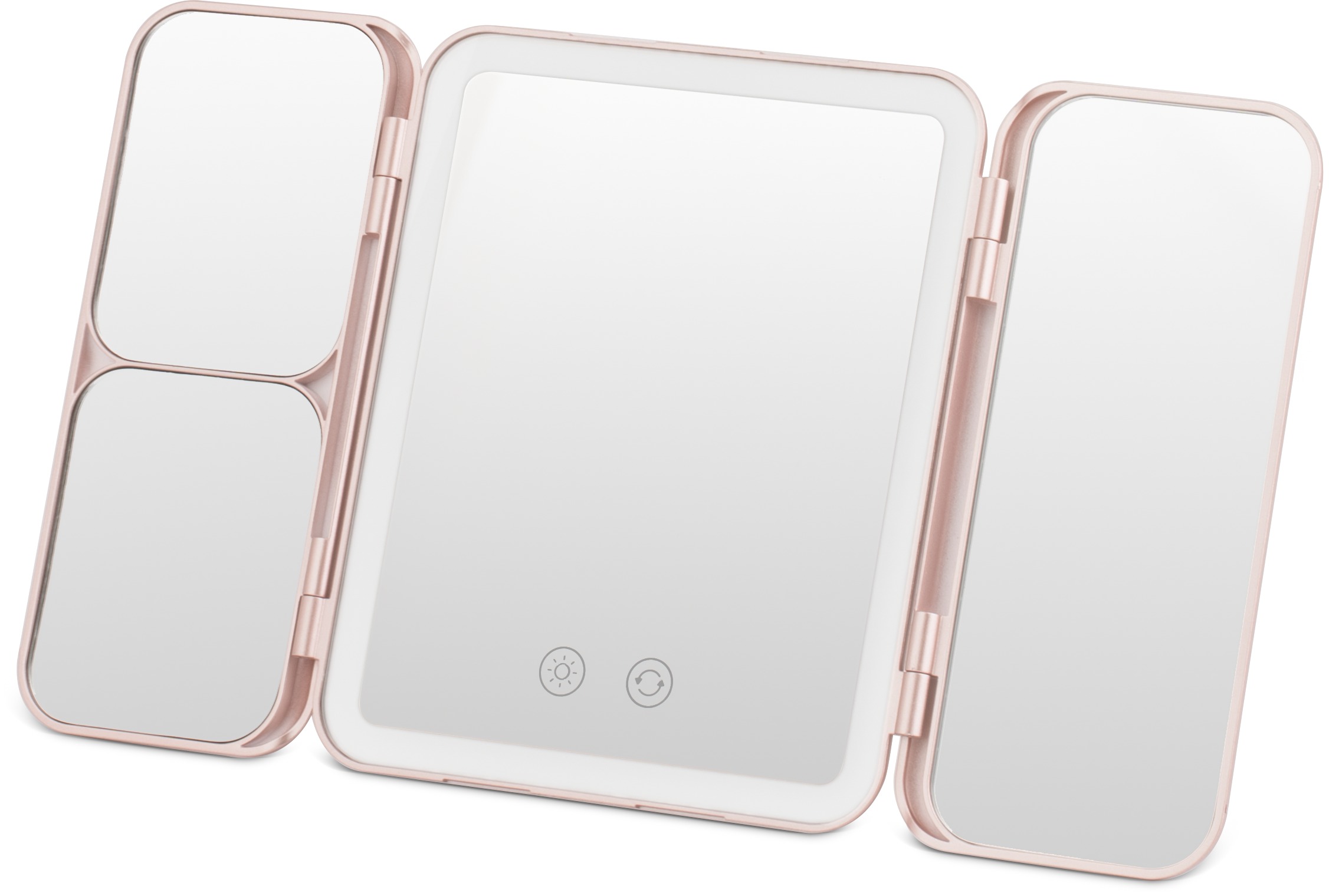 Kozmetické zrkadlo – stolné, roztváracie, polohovateľný stojan, veľká delená zobrazovacia plocha so zväčšením 1×, 3× a 7×, LED podsvietenie, 64 LED diód, nastavenie teplého, studeného a imitácia denného svetla, možnosť postupného tlmenia svetla, nabíjanie pomocou…