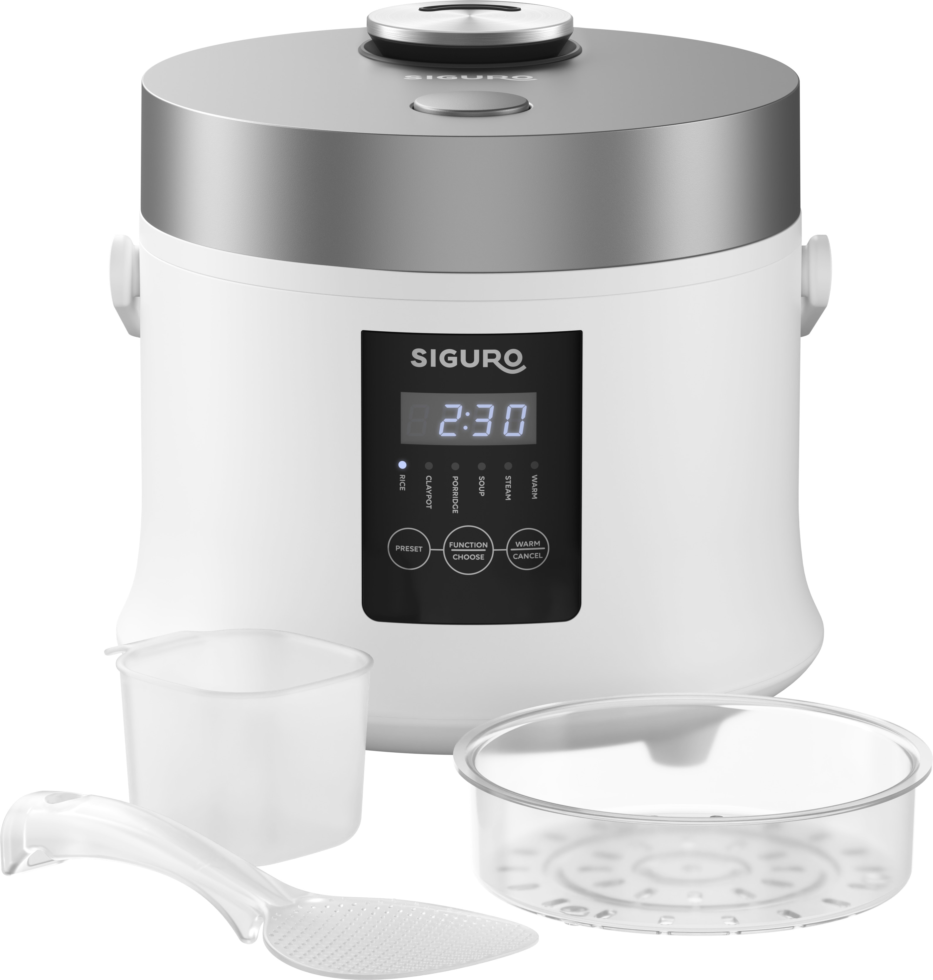Ryžovar – celkový objem nádoby 1,6 l, až na 450 g surovej ryže (6 porcií uvarenej ryže), displej, vyberateľná nádoba s nepriľnavým povrchom ILAG® Essential, 6 programov (ryža, Clay Pot, kaša, polievka, varenie na pare a udržiavanie teploty až 12h), automatické vypnutie, v balení lyžica na ryžu, odmerka (180 ml), naparovač na varenie na pare, sklopná rukoväť, veko s integrovaným parným ventilom, rozmery 21 × 22 × 21 cm, hmotnosť 2,05 kg, odnímateľný prívodný kábel s dĺžkou 1,2 m, tri roky záruka Ryžovar Siguro Rice Master Digital Gen. 2 R350WZaobstarajte si inteligentný ryžovar Siguro Rice Master Digital Gen. 2 R350W a potešte svoje chuťové bunky nielen dokonale uvarenou ryžou, ale aj polievk