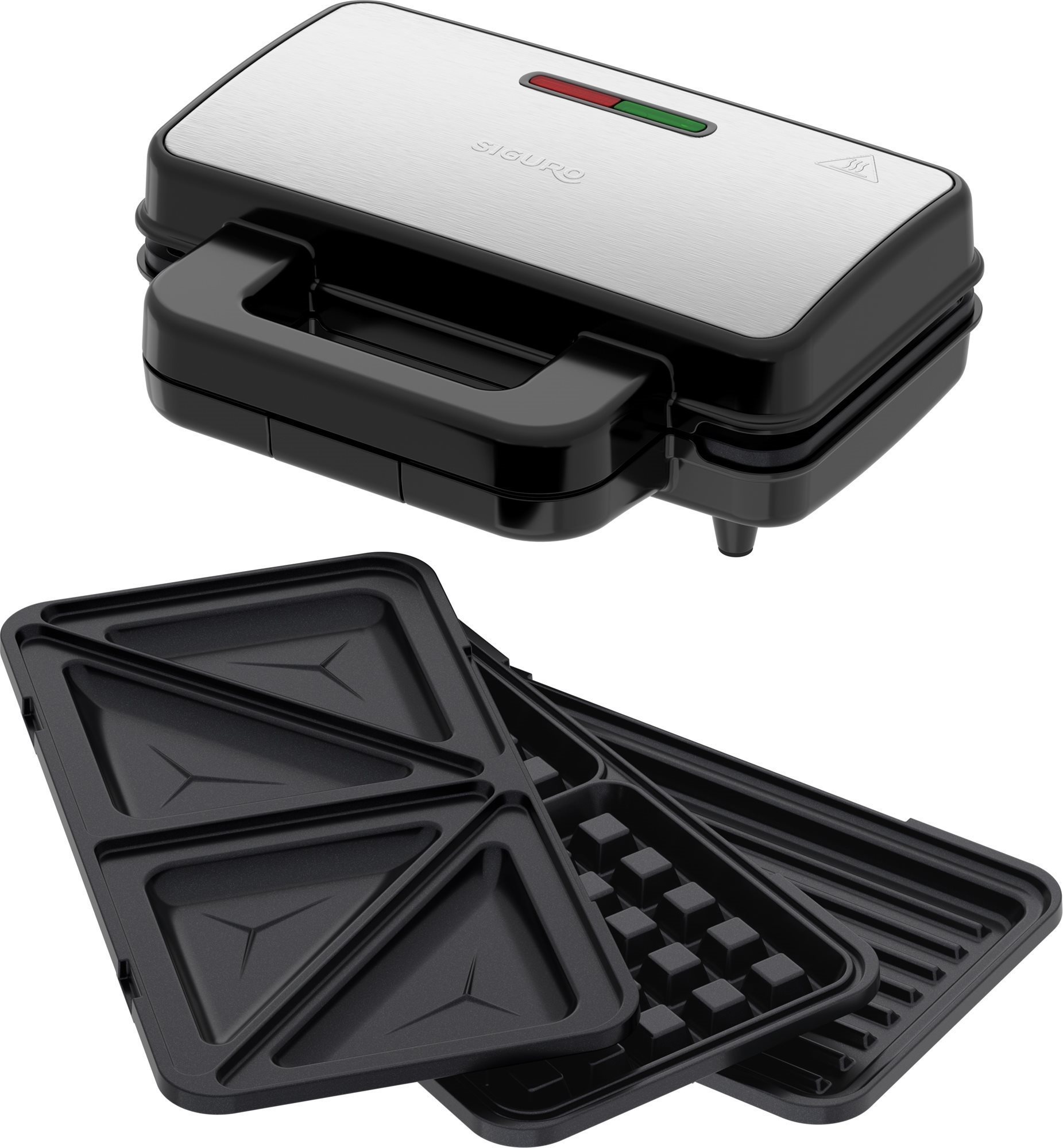 Toustovač – 3 v 1, s vyberateľnými platničkami, na 2 toasty, trojuholníkové platničky, s teflónovým povrchom, s nepriľnavým povrchom, súčasťou balenia platničky vhodné na vafle, na grilovanie, rozmery platničky 10 × 15 × 28,5 cm (V׊×H), s ochranou proti prehriatiu, uzamykateľný, tepelne izolovaná rukoväť a systém na uloženie kábla súčasťou, príkon 1000 W, antikorový plášť, dĺžka kábla 75 cm, rozmery 10 × 29 × 24 cm (V׊×H) Sendvičovač Siguro SM-D131S Perfect Toast 3in1Radi svoj jedálniček obohatíte o toasty, vafle alebo panini? V tom prípade by vám v kuchyni nemal chýbať sendvičovač Siguro SM-D131S Perfect Toast 3in1, k