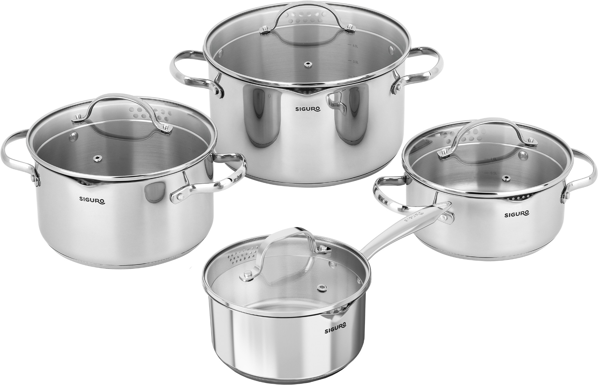 Sada riadu na varenie – z prvotriednej nehrdzavejúcej ocele, inteligentné pokrievky s okrajmi umožňujúcimi cedenie, hrnce s lievikom Easy Pour, obsah súpravy a vnútorné rozmery: rajnica 16 × 7,5 cm (1,5 l), kastról 18 × 8,5 cm (2,11 l), kastról 20 × 11,5 cm (3,55 l), hrniec 24 × 13,5 cm (6,02 l), nitované držadlá, jednoduchá údržba, vnútorná miera na ľahkú orientáciu, sklenené pokrievky s otvormi na únik pary, možnosť použitia na všetkých typoch varných dosiek, v rúre aj s pokrievkou do max. 250 °C, vhodné do umývačky riadu, 3 roky záruka Súprava hrncov Siguro Pure DelightPraktická súprava hrncov Siguro Pure Delight ponúka perfektné riešenie na každodenné varenie – kvalitnú nehrdzavejúcu oceľ, inteligentné pokrievky a integrované vylie