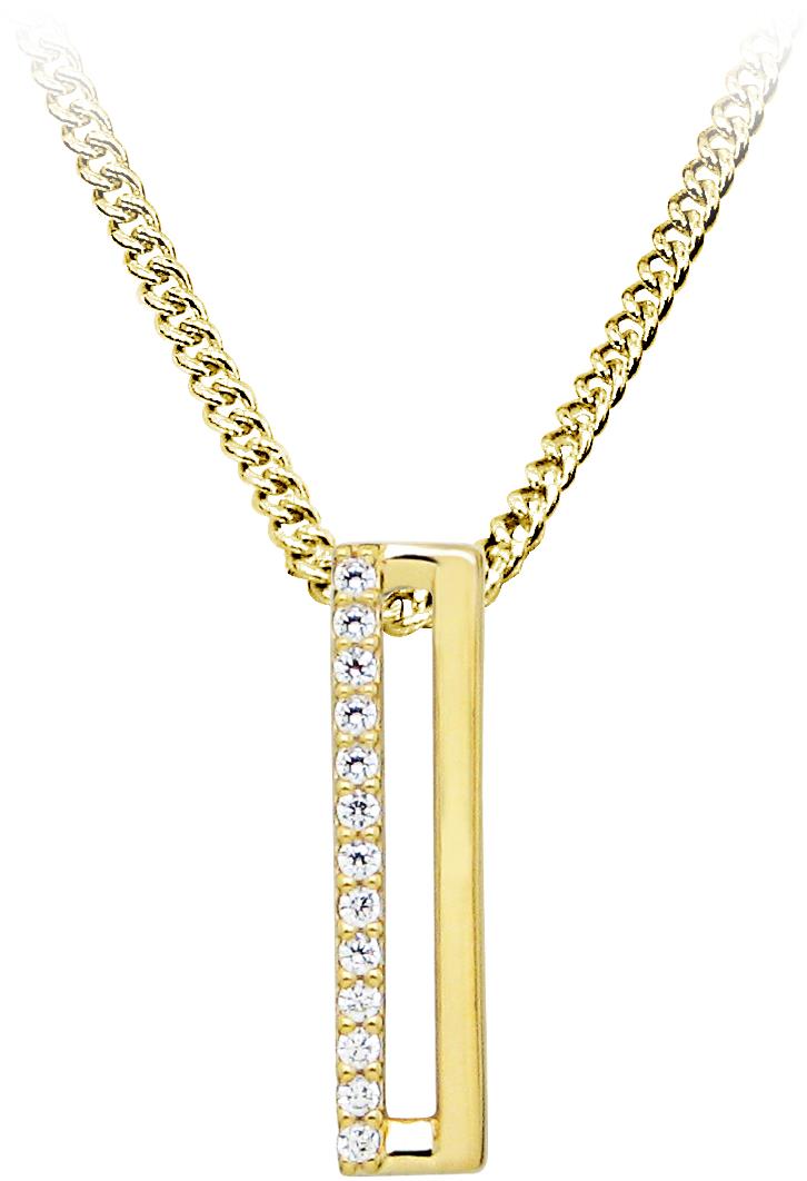 Prívesok – strieborný, rýdzosť: striebro 925/1000, pozlátený, zirkóny súčasťou, zlatá farba, motív znamenie zverokruhu Strieborný prívesok Silver Cat s retiazkou (42 + 3 cm), leštené striebro v zlatej farbe, prívesok je zdobený 13 ks bielych kubických zirkónov. Rozmer prívesku: 0,4 × 1,5 cm