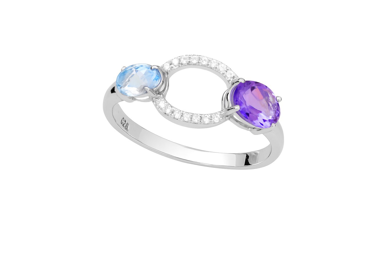 Prsteň – dámsky, materiál striebro, ródiovaný, hmotnosť 1,9 g, do prsteňa sú zasadené ametyst, topás a zirkóny, 17 kameňov, oválny tvar drahokamu, briliantový brus drahokamu, obvod 54 mm, vnútorný priemer 17,2 mm Prsteň SILVER CAT…