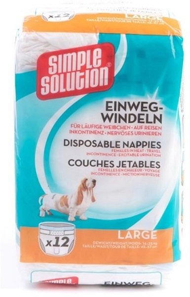 Plienky pre psov – s nastaviteľnými pruhmi, v balení 12 ks, veľkosť L pre psov s hmotnosťou 16 – 25 kg s obvodom pása 45 – 57 cm Jednorazové plienky pre psov Simple Solution sú praktickým riešením pre psov s problémami s močovou inkontinenciou či s močením pri vzrušení alebo pre sučky v období hárania. Sú vyrobené z mikrovlákna