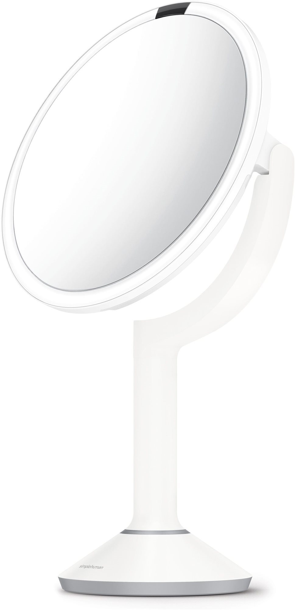 Kozmetické zrkadlo zväčšovacie, s osvetlením – stolné, led osvetlenie, polohovacie a obojstranné, materiál sklo, zväčšenie 10×, priemer 23,2 cm, napájanie na 1 integrovanú batériu Skvelý pomocník Simplehuman Sensor TRIO ST3038 pre dokonalé nalíčenieObojstranné stolné kozmetické zrkadielko Simplehuman Sensor TRIO ST3038 je skvelým pomocníkom každej ženy, ktorá sa rada líči
