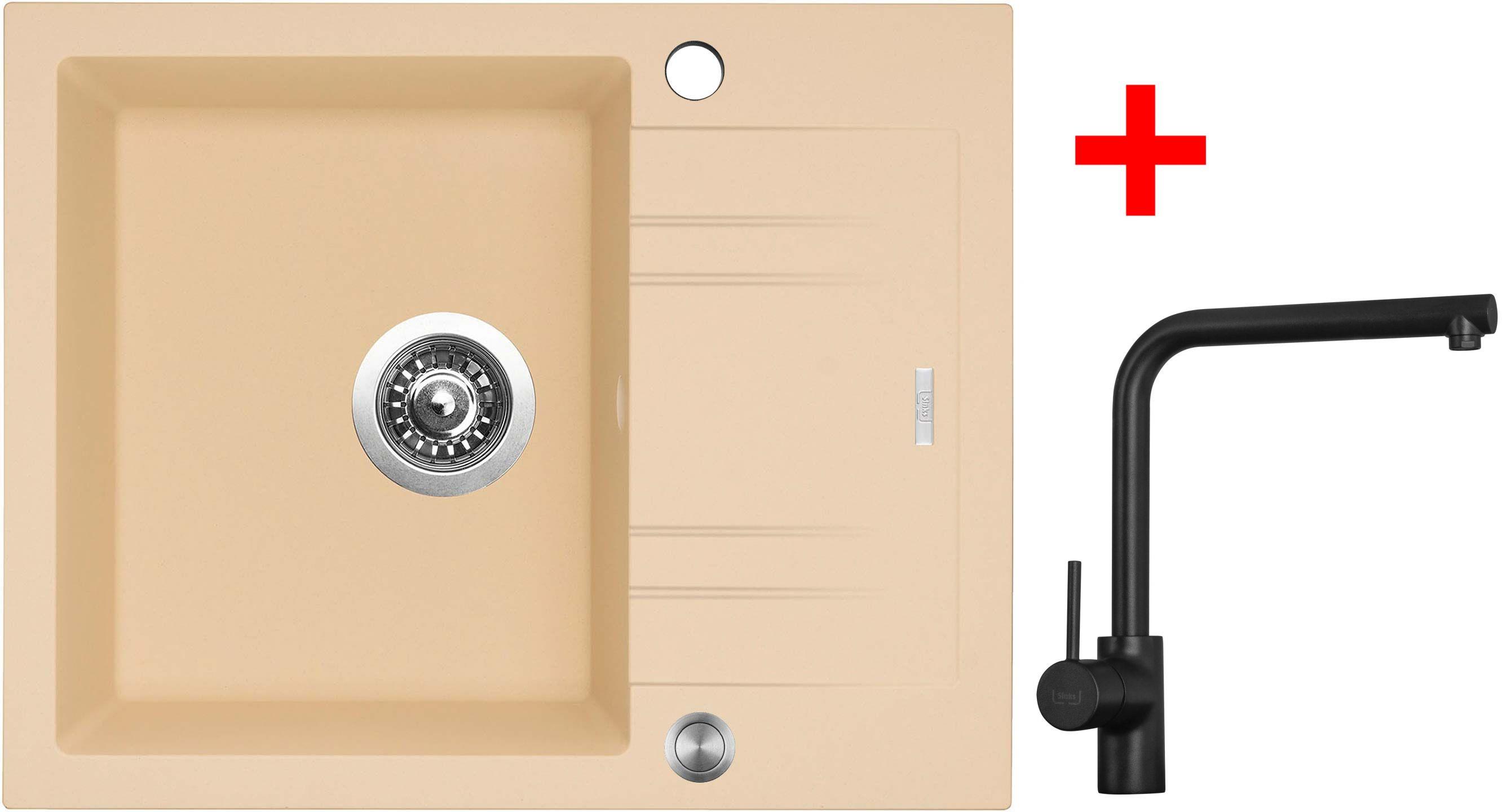 Set drezu a batérie – DREZ: obdĺžnikový tvar, jednodrezový, bez vaničky, s odkvapom, granitový materiál, montáž drezu len špecifickým spôsobom, sieťkový výpust, s pripojením na umývačku, farba sahara, celkové rozmery drezu: 60 cm × 48…
