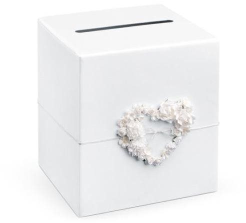 Darčeková krabička – kartónová škatuľa z perleťovo-bieleho papiera, s kvetmi v tvare srdca, určené na blahoželania či peňažné dary od svadobčanov, rozmery cca 24 × 24 × 24 cm Darčeková krabička PARTYDECO vám dopraje rýchlo a kvalitne zabaliť darčeky. Efektne uschová každý darček, a k tomu prináša jedinečný vzhľad.
