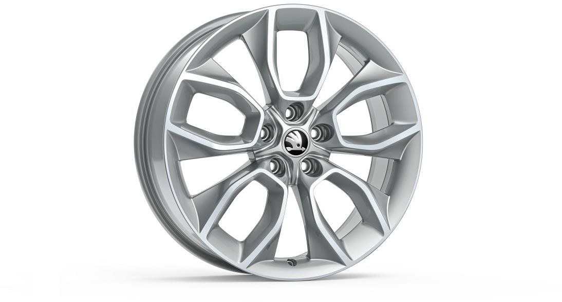 Alu disk – priemer disku 19″, rozstup skrutiek 5×112, ET 43 mm, strieborná farba Alu disk Škoda váži menej ako klasický plechový disk, čím sa zlepšuje ovládateľnosť vozidla a znižuje záťaž tlmičov. Lepšie odvádza teplo, preto pomáha brániť prehriatiu bŕzd a udržuje ich stabilný vý