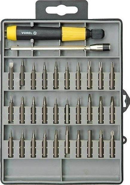 Skrutkovač – hodinársky, imbusový, plochý, krížový a torx, na bity, ergonomická plastová rukoväť, materiál drieku CrV oceľ, driek v balení Hodinársky magnetický skrutkovač má v súprave výmenné bity Torx, ploché, krížové, Phillips, pozidrive a imbusové HEX. Súprava obsahuje 30 ks tých najpoužívanejších nadstavcov pre rôzne druhy skru