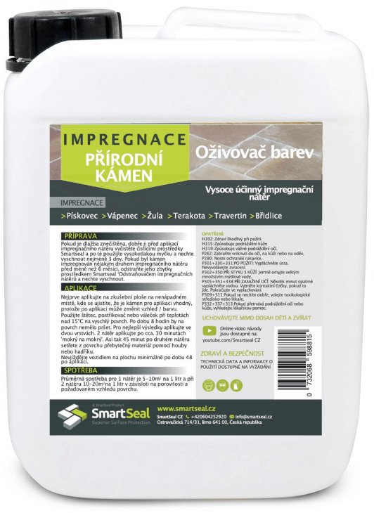 Stavebná impregnácia – na přírodní kámen, 5 l, oživí původní barvy kamene, odpuzuje vodu, povrch může dýchat Impregnácia na prírodný kameň Smartseal je ochranný impregnačný náter na zlepšenie farby prírodného kameňa s hydrofóbnymi vlastnosťami. Ide o akrylový impregnačný náter bez obsahu rozpúšťadiel. Impreg