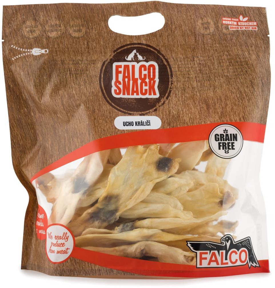 Sušené mäso pre psov – na posilnenie žuvacích svalov a odmena, pre všetky plemená s normálnou aktivitou, králičia príchuť, bez obilnín, bez GMO Všetky sušené mäsové pochúťky Sokol Falco Snack sú sušené iba horúcim vzduchom bez pridaných látok, nie je použitá žiadna chémia. Na sušenie sa používa moderná technológia na uchovanie veľkého množstv