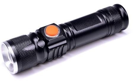 Baterka – LED, nabíjacia, max. dosvit 180 m, svetelný tok 200 lm, 1 LED žiarovka, životnosť 50000 h, odolná proti vode, stupeň krytia IP44, režim stroboskopu, nastavenie intenzity svetla a USB nabíjanie, max. výdrž 3…