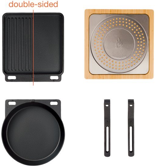 Grilovacie príslušenstvo – Súprava liatinového riadu na rozšírenie využitia pizza pece (okrúhla panvica, grilovacia mriežka/doska, liatinové rukoväti, bambusový/oceľový podstavec) Súprava liatinového riadu Solo Stove Pi je navrhnutá na dokonalé varenie s intenzívnou chuťou. Liatinový riad zvyšuje kvalitu pokrmov, zosilňuje chute a zaručuje rovnomerné výsledky vďaka výnimočnej s