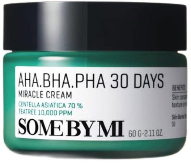 Krém na tvár – vhodný na atopickú, ekzematickú, citlivú, mastnú, normálnu, problematickú, zmiešanú, suchú a zrelú pleť, vyhotovenie: kórejská kozmetika a ekologické, vyživujúci a detoxikačný, pre vekovú skupinu 18+ Krém SOME BY MI AHA BHA PHA 30 Days Miracle Cream predstavuje intenzívne upokojujúci a regeneračný prípravok, ktorý pôsobí proti nedokonalostiam pleti už počas 30 dní. Obsahuje komplex exfoliačných ky