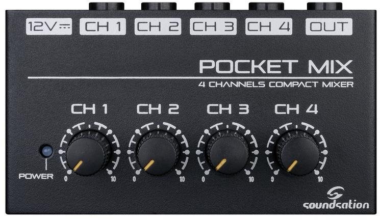 Mixážny pult – analógový, 4 kanály, vstupy: 4× 6,3 mm Jack, výstupy: 1× 6,3 mm Jack Mixpult Soundsation Pocket-Mix je jednoduchým zlučovačom vstupných signálov s korekciou ich hlasitosti. Ide o ultrakompaktné riešenie, ktoré môžete mať stále pri sebe a využiť ho, keď budete práv