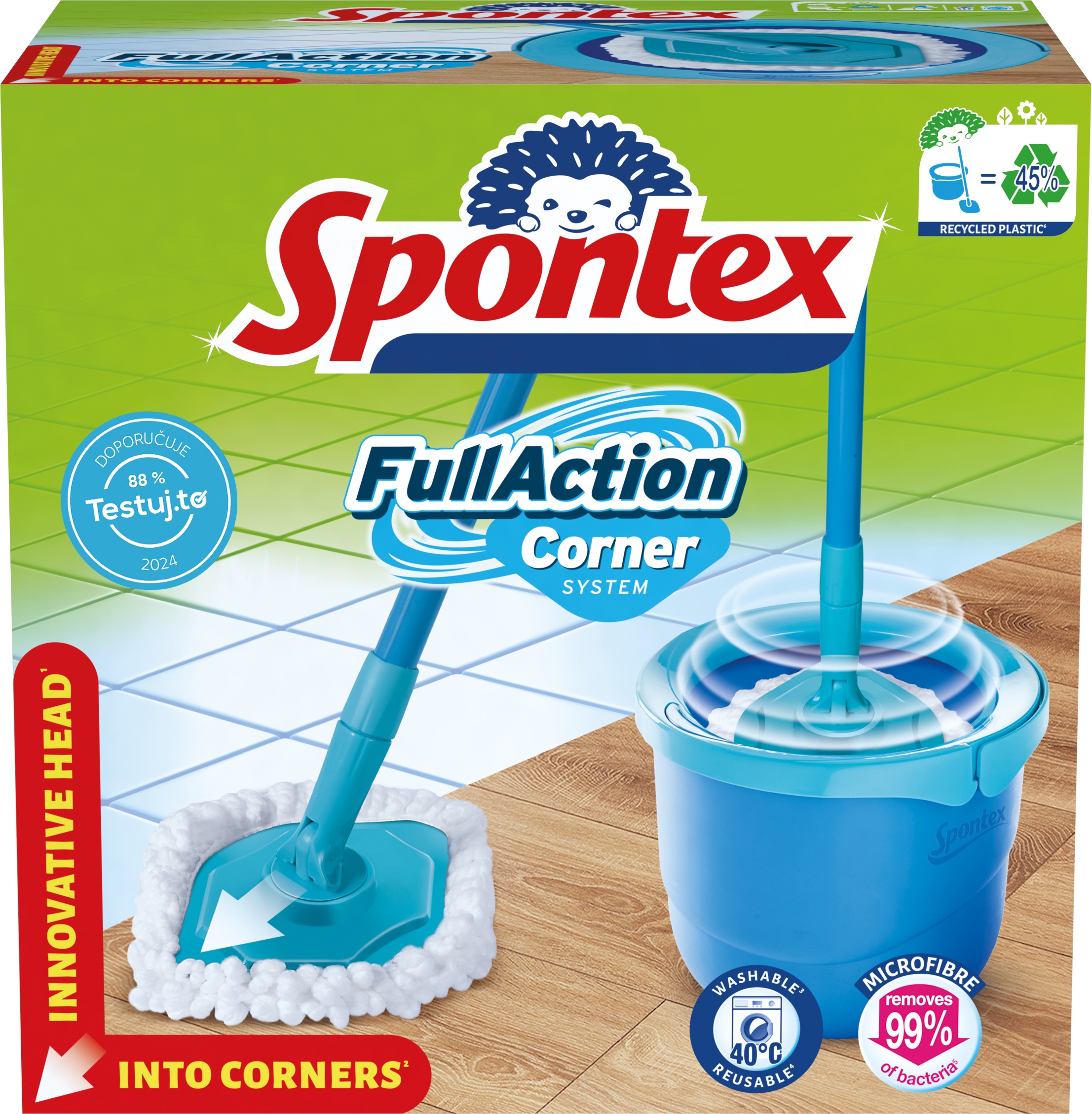 Mop – plochý, rotačné žmýkanie, teleskopická tyč a flexibilný kĺb, materiál utieracej plochy mikrovlákno, materiál tyče plast, objem vedra 6 l, vedro súčasťou balenia Full Action Corner System súprava strapcového mopu z mikrovlákna so šikovným 360 ° rotačným systémom na rýchle a efektívne vytieranie všetkých typov podláh. Inovatívna hlava mopu s jedinečným dizajnom