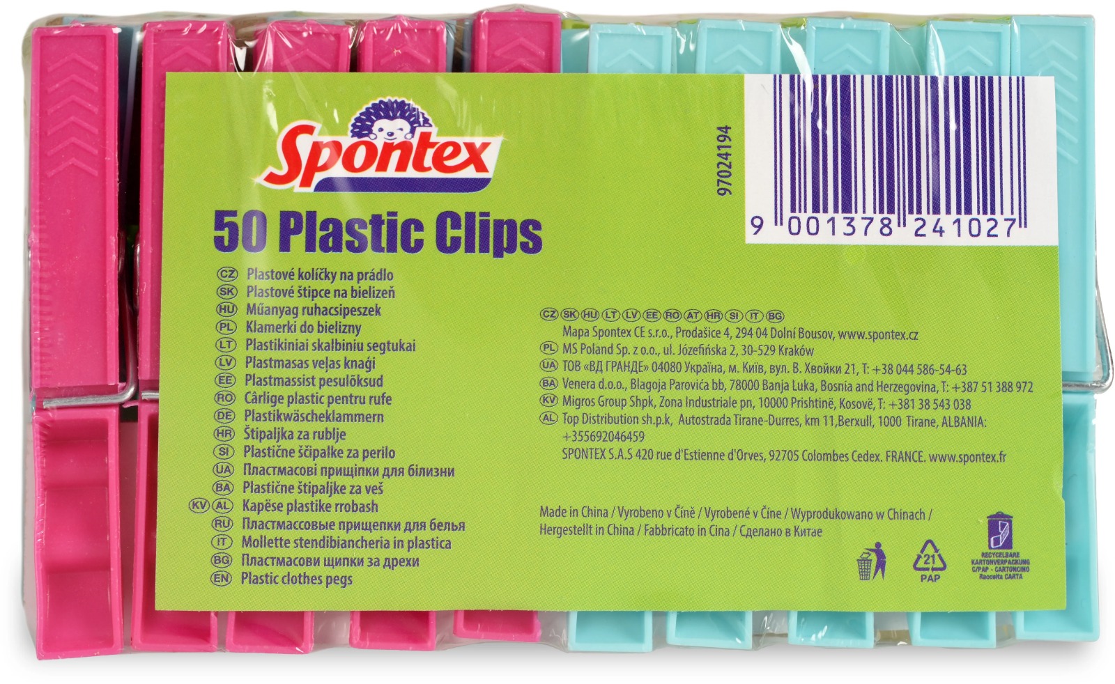 Štipce na bielizeň – plastové, s kovovou pružinkou, 50 štipcov súčasťou balenia, rozmery 7 × 1,3 × 2 cm (D׊×H) Súprava štipcov na bielizeň SPONTEX obsahuje viacfarebné klasické štipce vyrobené z odolného plastového materiálu a vybavené pevnou oceľovou pružinou. Štipce na bielizeň sú robustné, nelámu sa ani neh