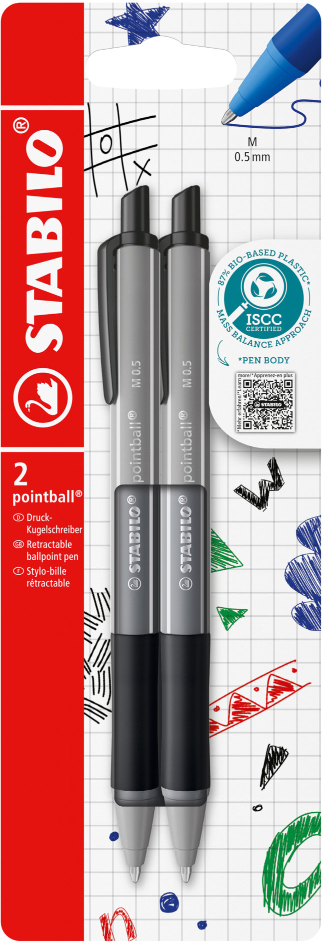Guľôčkové pero – olejový atrament, čierna farba náplne, vymeniteľná náplň a pogumované držadlo, pre pravákov a pre ľavákov, 2 kusy v balení, materiál plast, šírka stopy 0,5 mm, s výsuvným hrotom, škatuľka súčasťou Hlavné vlastnosti guľôčkového pera STABILO pointball colorful, čierne – súprava 2 ksGuľôčkové pero STABILO patrí medzi stále obľúbené nestarnúce písacie potrebyStláčací mechanizmus guľôčkového peraVyr
