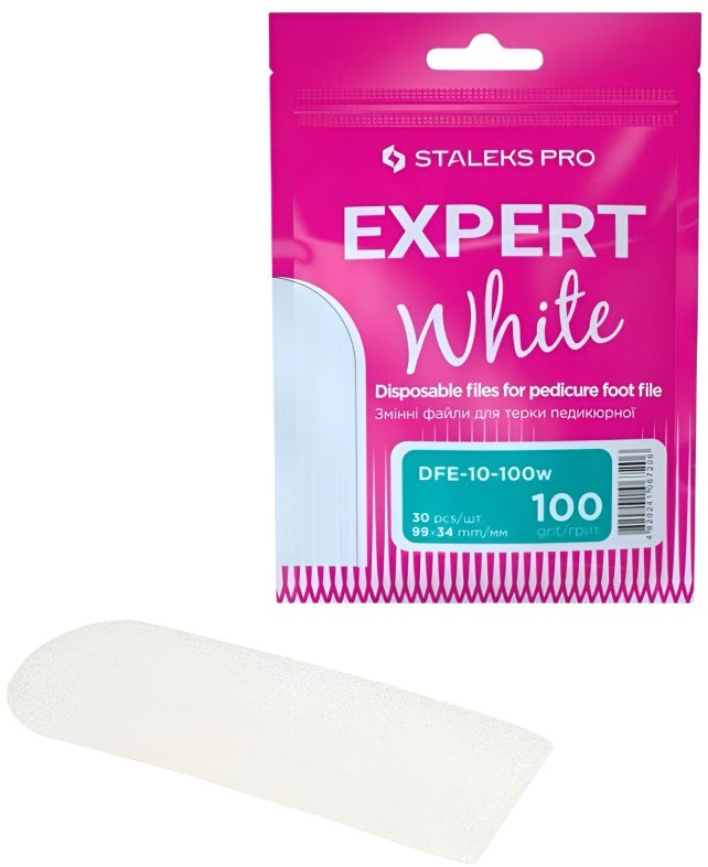Pilník na nohy – jednorazové pilníky na pedikúru biele, 30 ks Súprava náhradných pilníkov na pedikúru Staleks PRO Expert 10/100 sa používa v salónoch spoločne s kovovou základňou a minimalizuje riziko prenosu infekcie pri ošetrení nôh. Hygienické bezpečnosti je