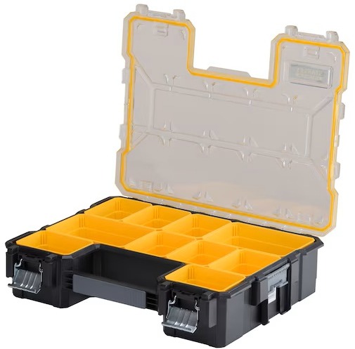Organizér na náradie vodotesný, poistka zásuviek a voľne stojacia, rozmery 10,9 × 33 × 44,6 cm, materiál: kov, plast a polykarbonát, hmotnosť 2 kg, nosnosť 8 kg Profesionálne organizér Stanley FatMax 1-97-518 v hlbokom prevedení ponúka vyberateľné priehradky, rozdeľovače i vodotesnosť. Ak hledáte spôsob, ako bezpečne a prehledne uložiť napr. skrutky v rôznych