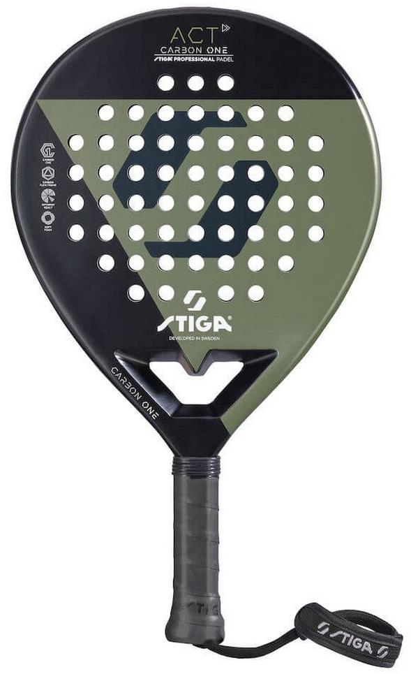 Padelová raketa – okrúhly tvar, pre hráčov všetkých úrovní, vyváženie do ruky, materiál jadra EVA Soft, materiál rámu karbón, šírka rámu 38 mm, hmotnosť 355 g, zelená a čierna farba Padelová raketa Stiga Padel ACT je ľahká a pružná a odpúšťa chyby aj pri úderoch mimo stred. Tenká karbónová vrstva Carbon One zaisťuje vysokú rýchlosť a presnú kontrolu. Raketa ponúka veľký sweet spo