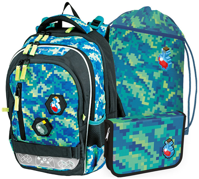 Školská súprava vhodná pre chlapcov, obsahom školskej súpravy batoh, nevybavený peračník a vrecko na topánky/cvičebný úbor, vhodné od 6 rokov Školská súprava Stil 365 Junior Pixel Quest je zložená z praktických vecí, ktoré sa hodí pre každého malého školáka na úspešné začiatky so štúdiom. Školský batoh okamžite priláka pozornosť všetkých šk