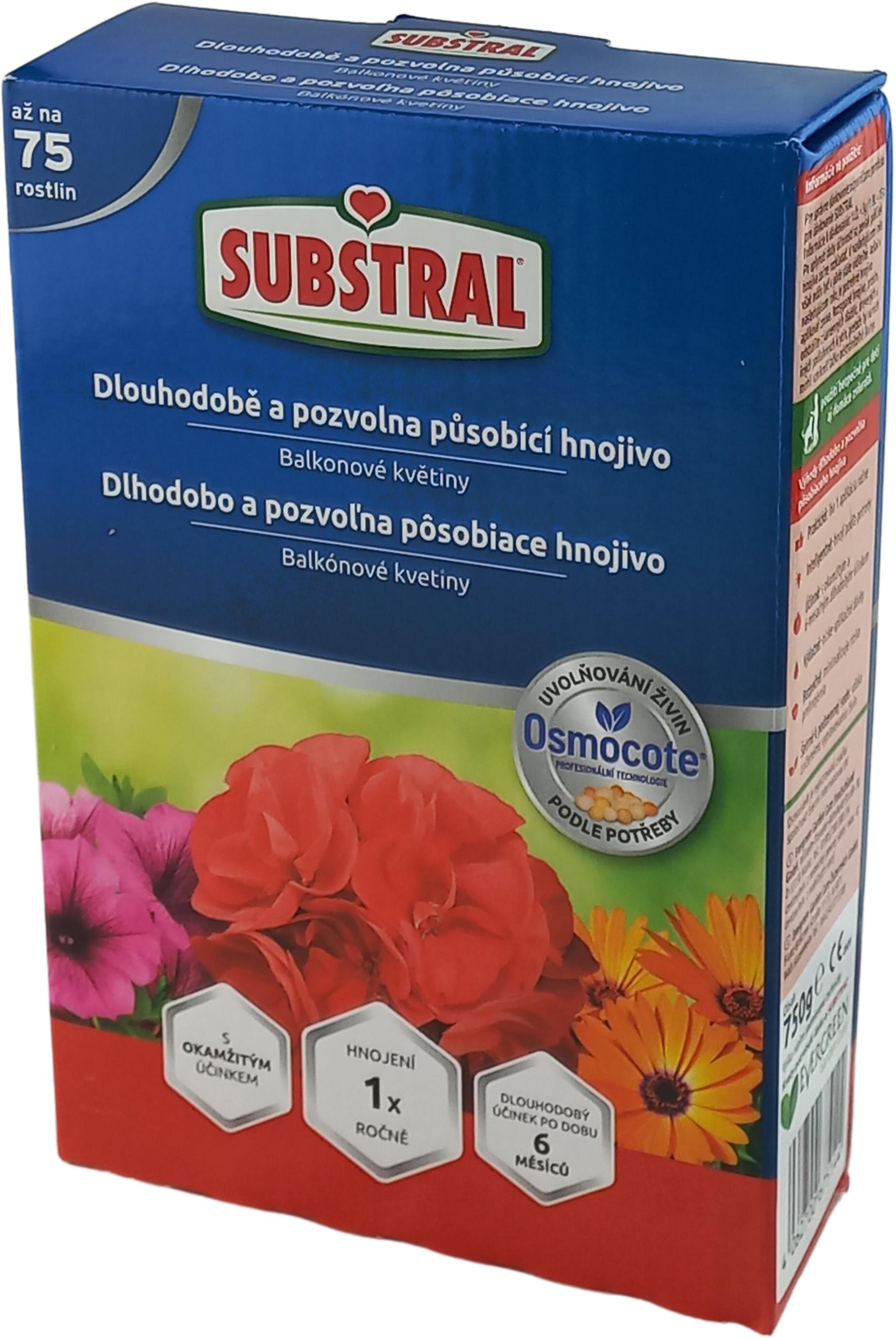 Hnojivo – určené pre: balkónové kvety, muškáty a petúnie, minerálne zloženie, granule, hmotnosť 0,75 kg, aplikácia ku koreňom Dlhodobo a pozvoľna pôsobiace hnojivá SUBSTRAL sa vyznačujú inteligentnou technológiou hnojenia, ktorá pochádza z profesionálneho sektora. Tá umožňuje hnojenie podľa potreby s vynikajúcim okamžitým a