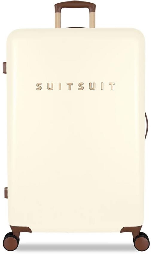 Cestovný kufor – na kolieskach, veľký, škrupinový, objem 91 l, rozmery 77 × 50 × 28 cm (V׊×H), upínacie pásy, vnútorné vrecko a vnútorná deliaca priehradka, 4 otočné a zdvojené kolieska, zapínanie dvojcestným zipsom, TSA zámok, bočné a horné držadlo, biela farba, jednofarebný motív, hmotnosť 4,5 kg SUITSUIT® Fab Seventies vo veľkosti L je ideálnym spoločníkom pre každého, kto chce cestovať štýlovo a zároveň prakticky. Jeho elegantný dizajn v kombinácii s úchytmi z vegánskej kože a detaily v ružo