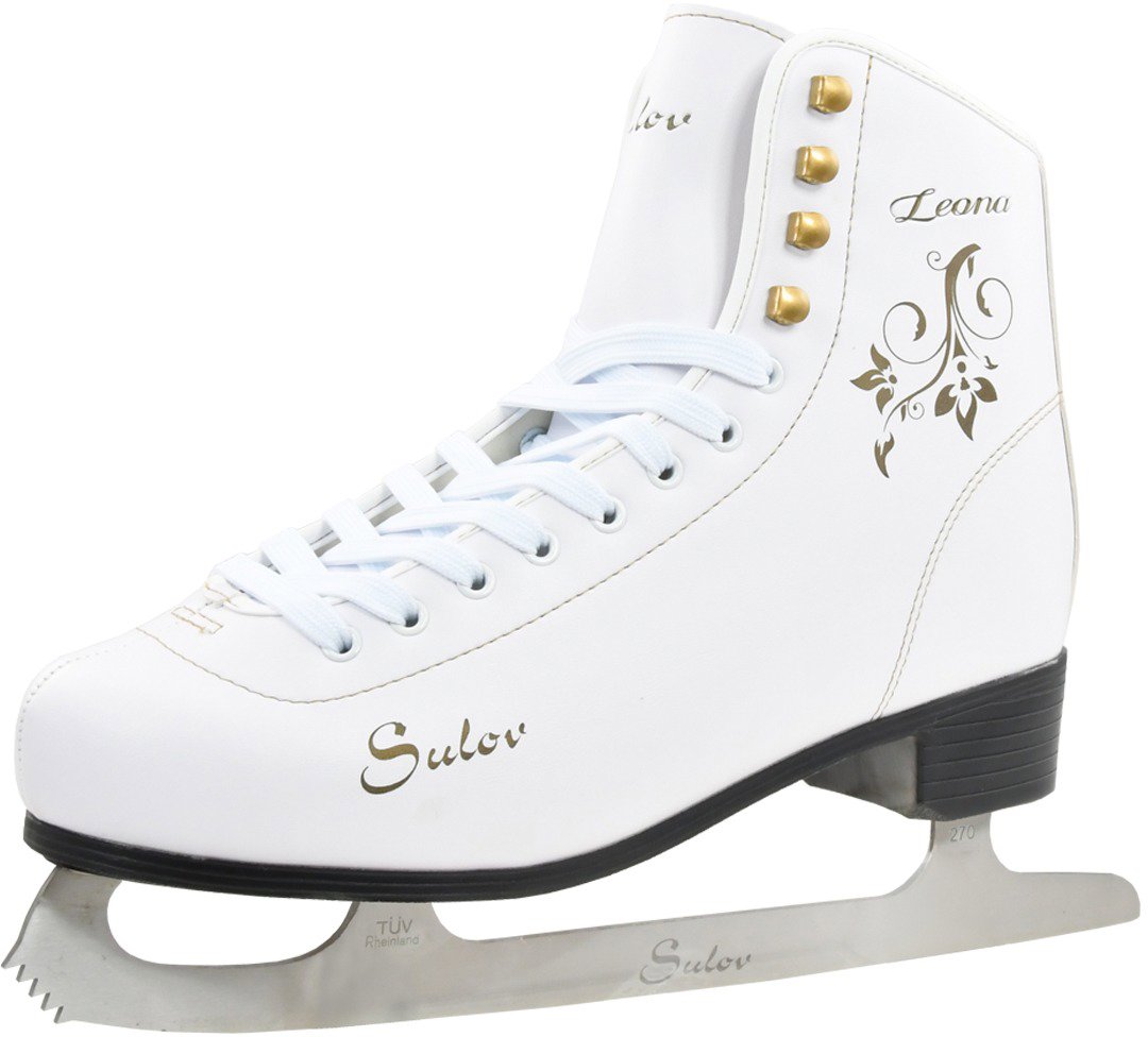 Korčule na ľad Sulov – dámske, určenie podľa výkonnosti: amatérske, na krasokorčuľovanie, systém zapínania šnúrky, anatomicky tvarovaná topánka, materiál rámu plast a materiál skeletu PVC, nehrdzavejúca oceľ noža, veľkosť EU 40, biela farba topánky Dámske ľadové korčule SULOV® LEONA sú vhodné pre začínajúce aj rekreačné korčuliarky, ktoré hľadajú spoľahlivú výbavu na svoje prvé kroky na ľade. Skelet z cold resistant PVC si zachováva pružnosť aj
