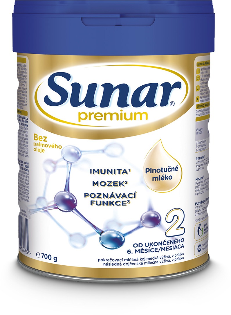 Dojčenské mlieko Sunar Premium – následné, bez konzervantov a umelých farbív, bez sóje a bez pridaného cukru, vhodné od 6 mesiace, veková kategória 2, hmotnosť 700 g Sunar Premium 2 pokračovacie dojčenské mlieko 700 gPre bábätká Sunar vyvinul pokračovacie dojčenské mlieko Premium 2, ktoré je určené deťom, ktoré nemôžu byť dojčené alebo sa snažíte dojčenie postupne