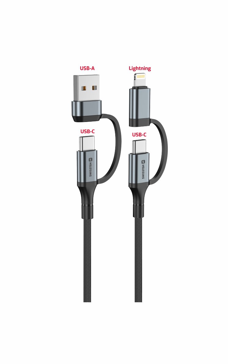 Dátový kábel 1,5 m – prepojovací, male konektory: 1× USB-C + 1× USB-A + 1× lightning, kovové telo, rovné a odpojiteľné zakončenie, bežný oplet Kľúčové prednosti dátového kábla Swissten textilný dátový kábel 4in1, 3. A 1,5…