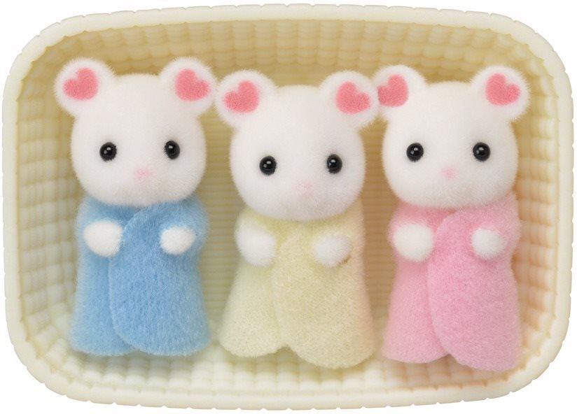Figúrka – výška 10 cm, zvieratká, na hranie, motív Sylvanian Families, materiál plast a plyš, vhodná od 3 rokov Rozkošné myšacie trojičky čakajú na to, keď sa s nimi začne niekto hrať. Baby Marshmallow myšky sú vyrobené z plastu, ktorý je potiahnutý mäkučkým plyšom. Očká, ktoré sú ako živé, sú vyhotoven