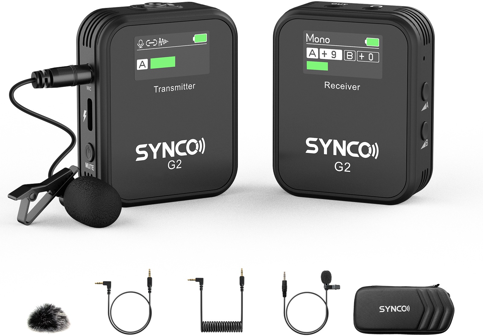 Bezdrôtový systém – jednokanálový mikrofónny systém, signál dosahuje 200m, klipový vysielač má vstavaný mikrofón, prijímač – 3.5mm jack, farebné TFT displeje, rozmery 5×4.3×1.7cm, hmotnosť 39g Bezdrôtový systém SYNCO WAir G2 (A1)SYNCO WAir G2 (A1) sa radí medzi miniatúrne jednokanálové digitálne bezdrôtové mikrofónové systémy. Sú skvelé predovšetkým pre natáčanie videí na sociálne siete, ro
