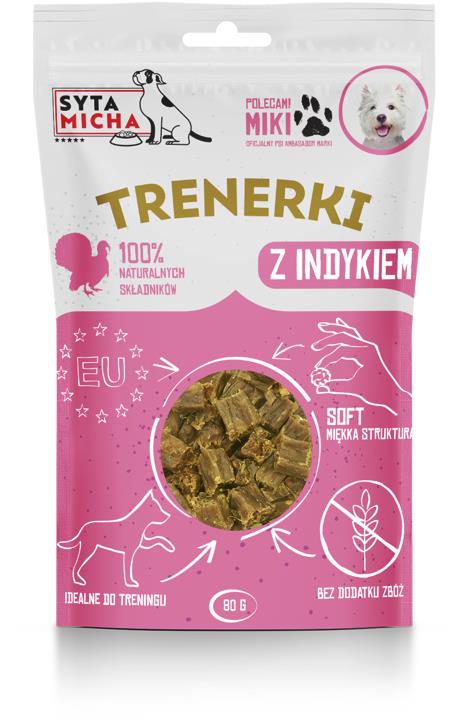 Maškrty pre psov – bez obmedzenia veku s nízkou, normálnou a vysokou aktivitou, morčacia príchuť, hmotnosť balenia 0,08 kg, hrubé bielkoviny 53 %, tuky (hydinový), špecifiká zloženia bez konzervantov a hypoalergénne Morčacie tréningové maškrty Syta micha sú skvelou voľbou pre všetkých psov, pretože uspokoja papule všetkých plemien a veľkostí. V maškrtách nájdete iba poctivé morčacie mäso a rastlinný glycerín. Vďa