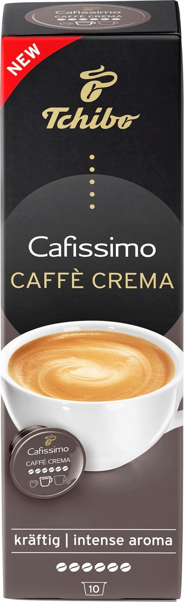 Kávové kapsuly na Tchibo Cafissimo – na káva bez sušeného mlieka, zmes kávových odrôd, intenzita dark, korenené tóny, pôvod kávy Ázia, materiál kapsuly plast, 10 kapsúl v balení Tchibo Cafissimo Caffé Crema Kräftig10 kapsúl, 75…
