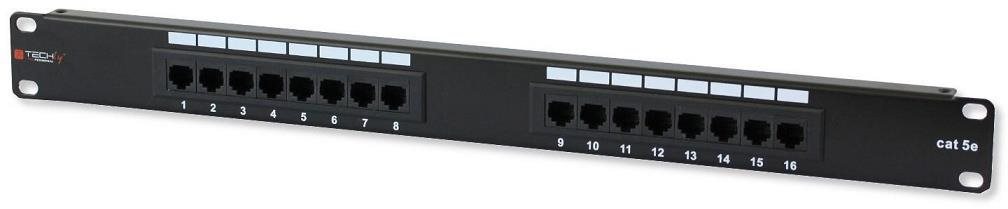 Patch panel – odolné pripevnenie medeného vodiča pomocou 3 mm kontaktov pokrytých 50-mikrónovým pozlátením TECHLY Patch Panel 16 Utp C5 je konštruovaný na montáž do skríň a rackov štandardu 19″ na použitie s netienenou krútenou dvojlinkou Cat5e (UTP). Je ideálny na inštalácie ethernetových sietí, Fast Eth