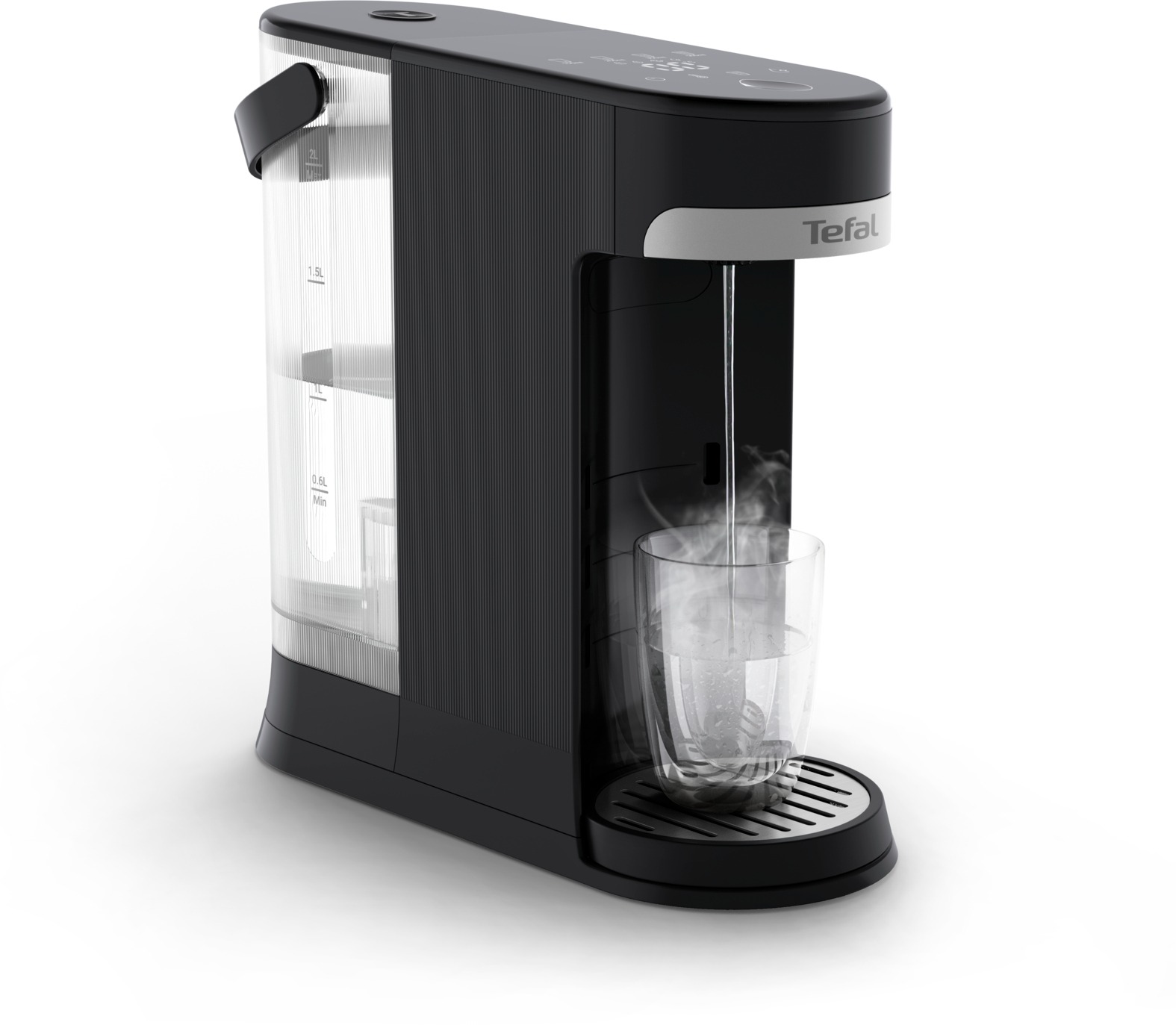Výdajník vody – so zásobníkom na vodu, s ohrevom, s nastaviteľnou teplotou, s voľbou objemu, s displejom, s dotykovým ovládaním, s vyberateľnou nádobou na vodu, celkový objem zásobníka 2 l, 6 teplotných úrovní, rozmery 30,5 × 12,8 × 32 cm (V׊×H), plastová konštrukcia, plastová nádoba, čierna farba, hmotnosť 2,335 kg Výdajník vody Tefal BR3508E0Výdajník horúcej vody Tefal Instant Hot Water BR3508E0 prináša pohodlie okamžite ohriatej vody v priebehu niekoľkých sekúnd a predstavuje rýchlu, úspornú a tichú alternatív